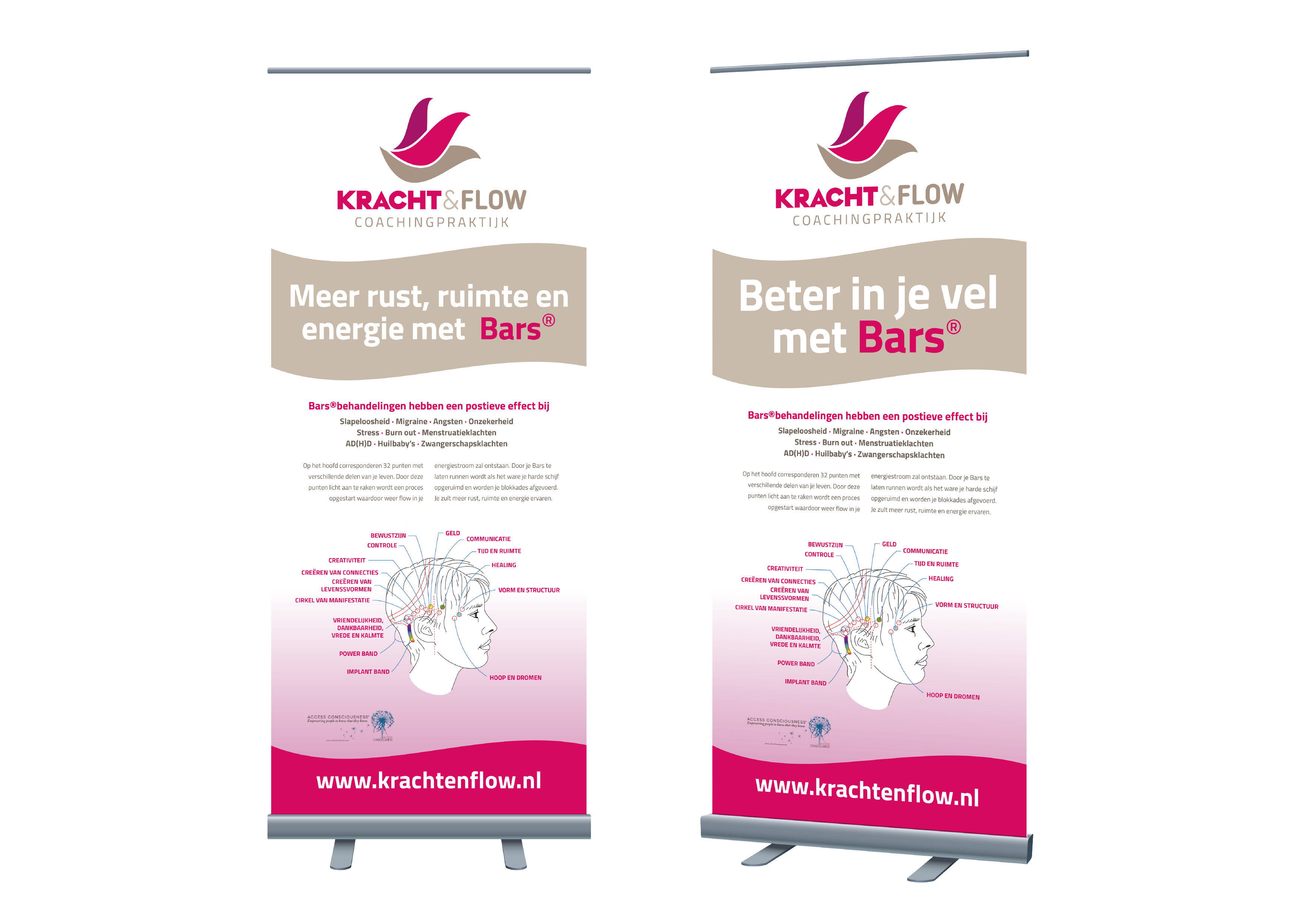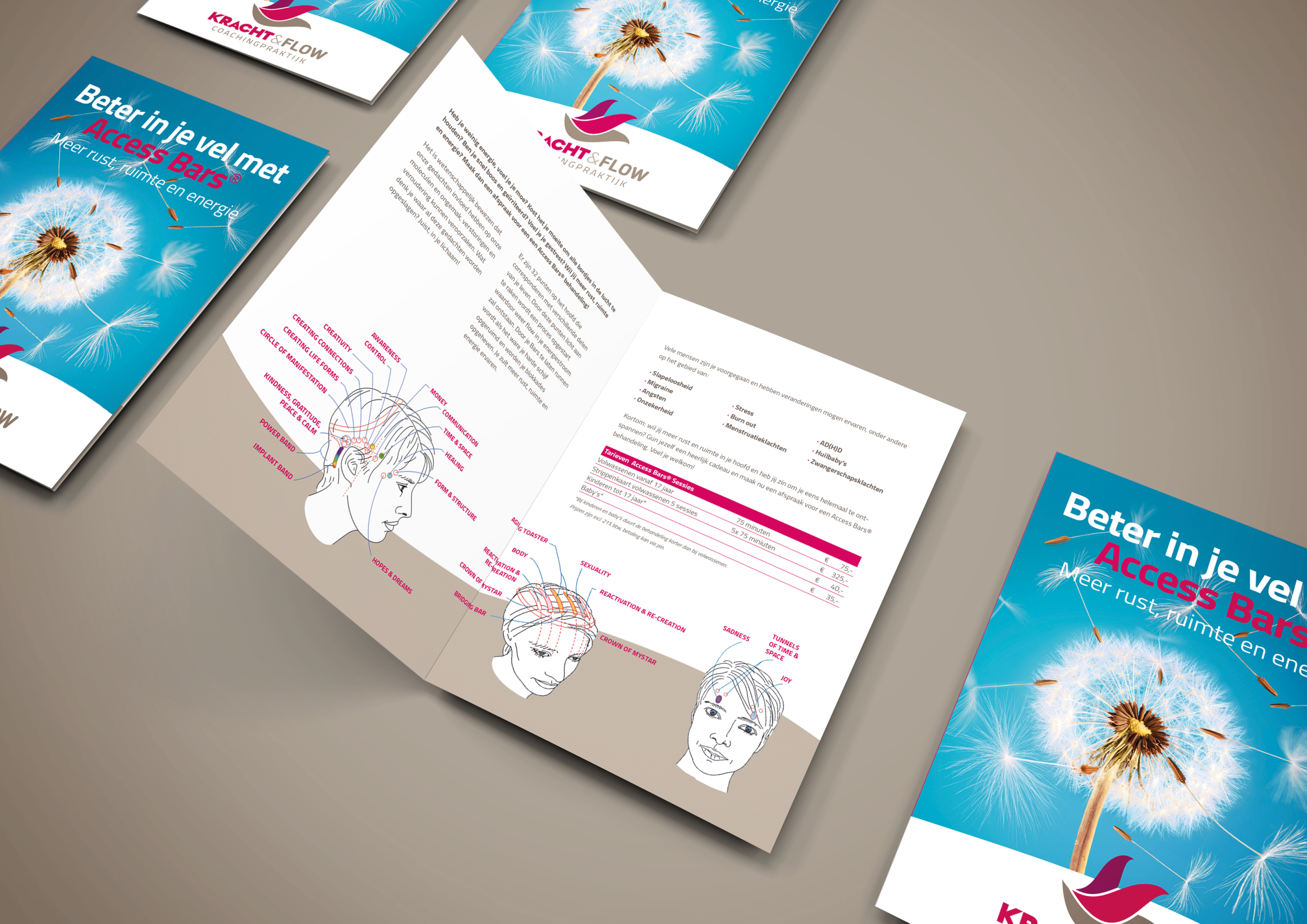 De Access Bars methode hebben wij in een folder en op banners grafisch weergegeven en hierbij de voordelen van de behandeling geëtaleerd. Dit alles verpakt in de huisstijl van Kracht & Flow maakt combinatie van betrouwbaarheid, kundigheid en dat met een positieve uitstraling.